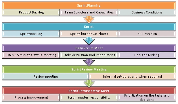 Specific prescribed development practices including sprints, daily scrums, sprint planning, sprint reviews, retrospectives.